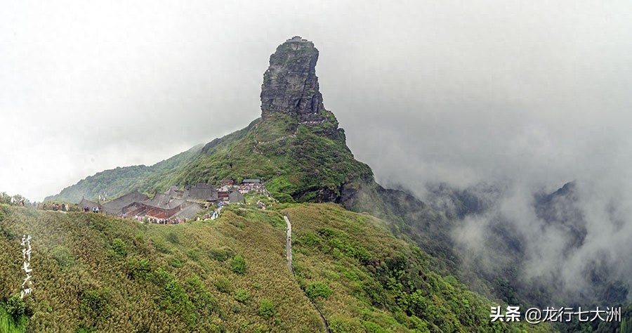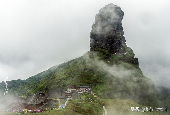 蘑菇石右侧是去老金顶的小路,有少数人去探奇的;红云金顶是梵净山的主要标志,在蘑菇石左侧的下山路上,下山乘索道就要经过红云金顶山下,山顶上有寺庙,等这个进度的人很多,但山路陡峭湿滑,是身强力壮者的选择,我只能远处看看,过过眼瘾罢了。红云金顶山下是承恩寺,在寺前的观景平台可近处观赏红云金顶。