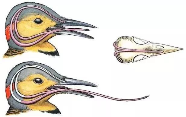它的舌头细长而富有弹性,从上颚(è,分隔口腔和鼻腔的组织)后部生出,有些种类啄木鸟的舌头甚至会穿过右鼻孔。