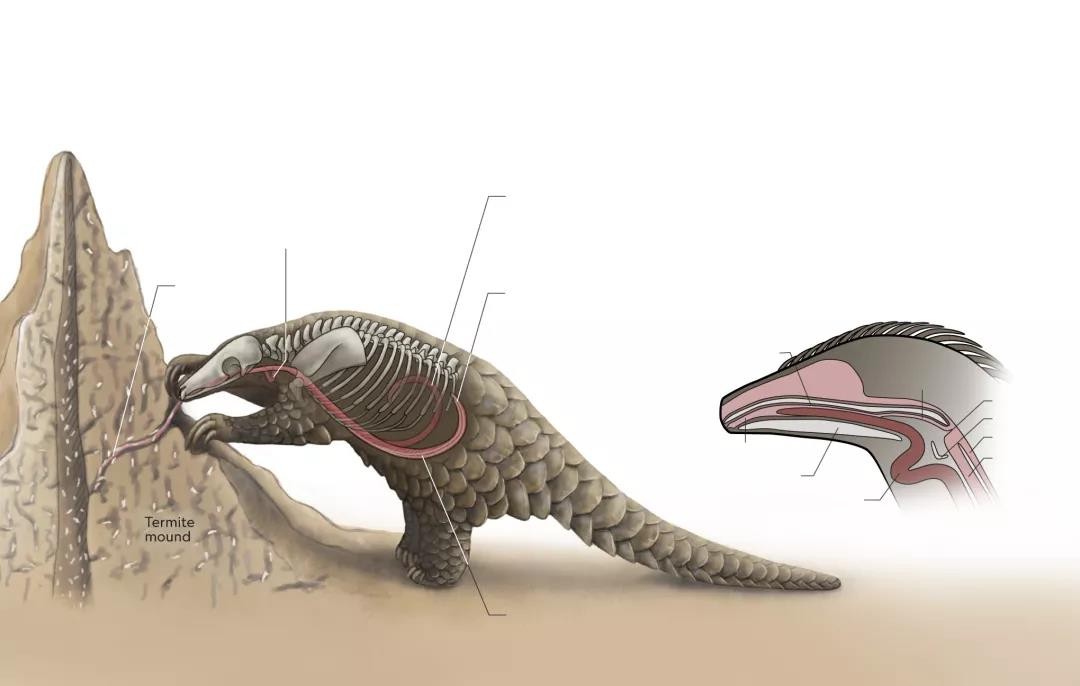 穿山甲没有牙齿,昆虫会在穿山甲喉咙的入口处被一根特殊的舌骨刮掉。