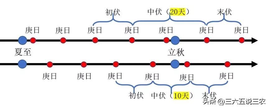 根据习俗规定,当夏至五庚日在立秋之前到来,那么中伏就会是有20天。如果夏至五庚日在立秋之后,那么,中伏只有10天。因为立秋之后的第个庚日就是末伏的开始日子。