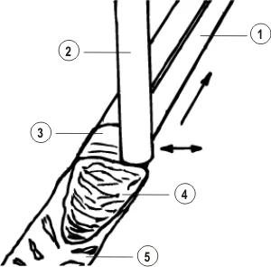 电焊条垂直于被焊工件表面,或斜偏一点点。电焊条在焊接方向有所倾斜。可见的电弧长度,也就是说电焊条熔坑的端头到工件表面的距离,应该和电焊条的焊芯直径大概相同。碱性焊条必须用更短的电弧来焊接(距离=0,5 x 焊芯直径)。为了保证这一点,焊接时碱性焊条的倾斜度要比氧化钛型焊条更直一些。在大部分的焊接位置都是一直往前焊,或者在向上焊而且焊缝间隙逐渐变大时也会做轻微的摆动焊。如果是焊接位置PF,就需要在整个焊缝区间做摆动焊接。通常都是采用拖着焊,只有在焊接位置PF是推着电焊条焊接。