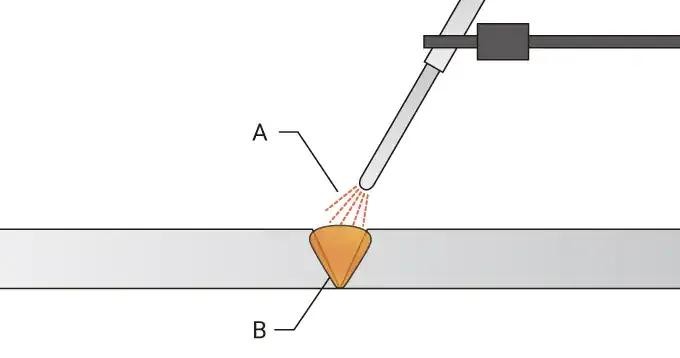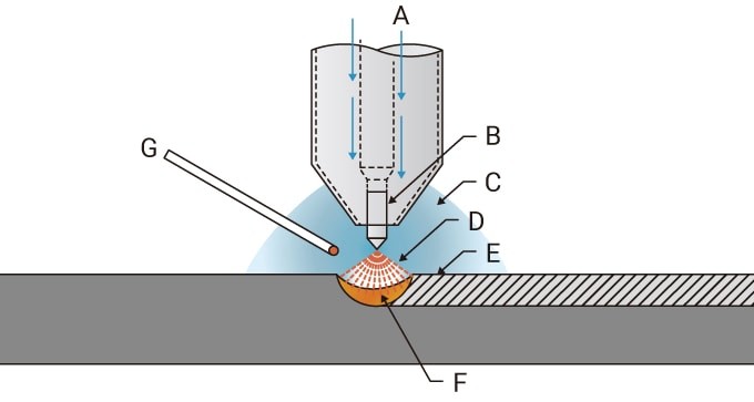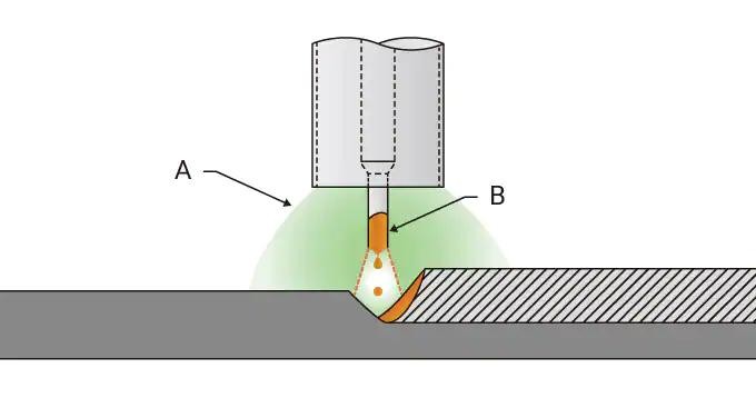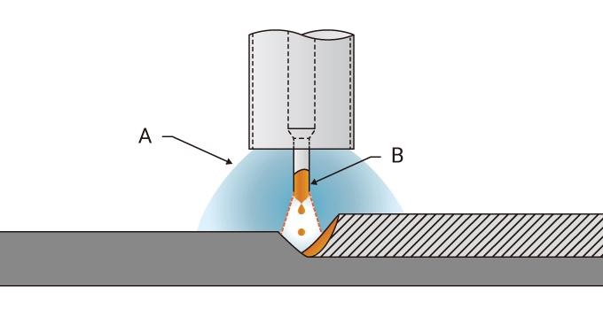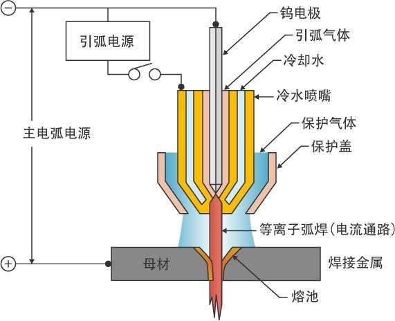 焊炬内流动的引弧气体(惰性气体)会被引弧热离子化(称为等离子)。离子化的引弧气体,会变成等离子喷射剂,从喷嘴孔喷出,成为电弧电流的导电体。通过这一转变,电弧会被浓缩成为高能量密度电弧,从内嵌凿孔喷出。高能量密度电弧的作用范围仅为TIG焊接电弧的4分之1左右,可以获得电流密度更高的电弧。
