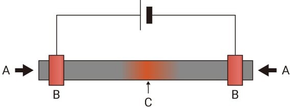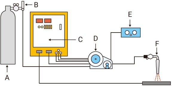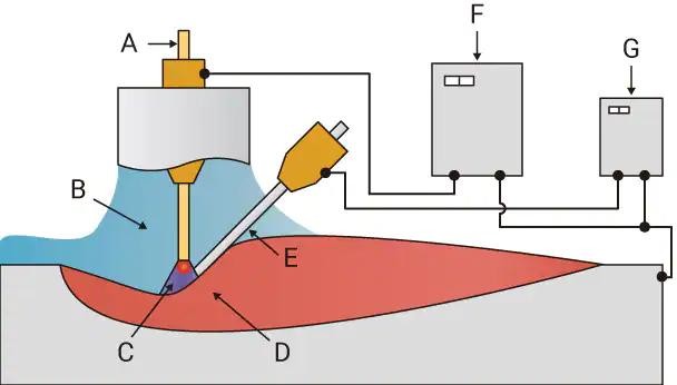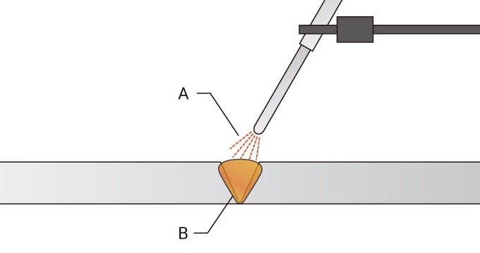 在电弧焊接中,利用“电弧放电”这一电气现象。电弧放电是指气体放电现象的一种,是在空气中产生的电流。对空间上相互独立的两个电极施加电压,破坏空气的绝缘,在两个电极之间产生电流,同时发出强光和高热。此时产生的弧(Arc)状光称为“电弧”,将电弧热用作热源的焊接方法就是“电弧焊接”。在电弧焊接中,对电极(焊接棒或焊丝)施加正电压,对母材施加负电压。这样,就会从母材向电极产生电弧。电弧的输出电流约为5 A至1,000 A,输出电压为8至40 V左右。电弧的温度约为5,000°C至20,000°C。铁的熔化温度约为1,500°C。母材和电极变为高温,融入后接合。