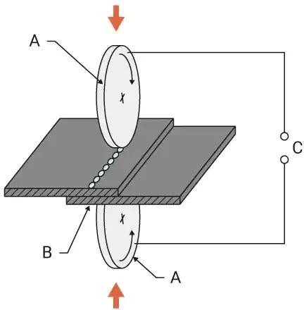用圆盘电极夹住焊接材,在旋转圆盘电极的同时通电,通过电阻加热,对焊接材进行连续接合的焊法。也被称为“搭接缝焊”。