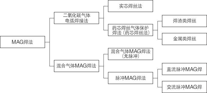 MAG焊接可根据保护气体种类、焊接焊丝种类等进行分类。