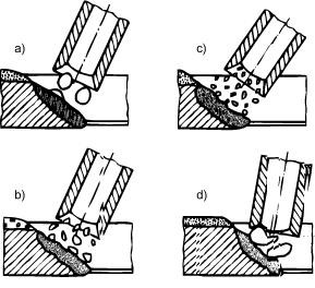 这张示意图显示了四种基本类型药皮的熔滴过渡状态:纤维素 (a),氧化钛 (b),酸性 (c),碱性 (d)。