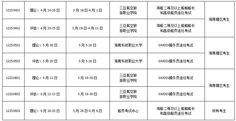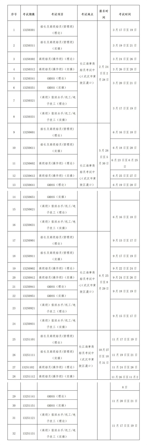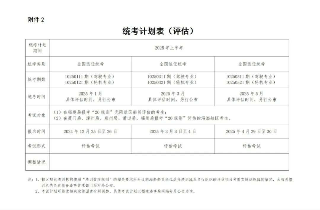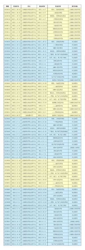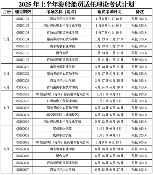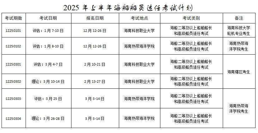 2025年上半年操作级船员理论考试共3期,适任评估2期。具体时间安排如下。