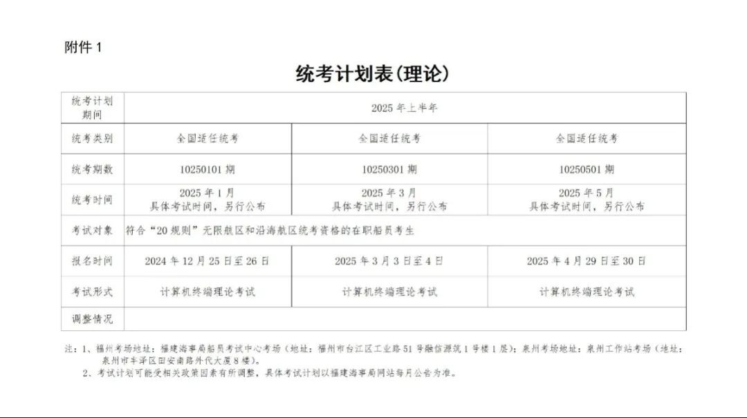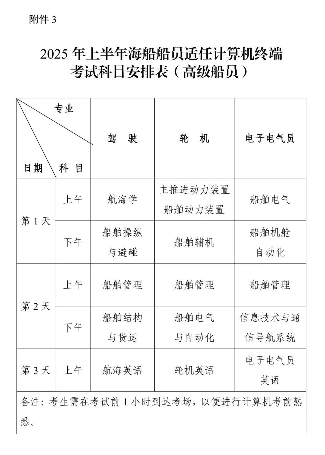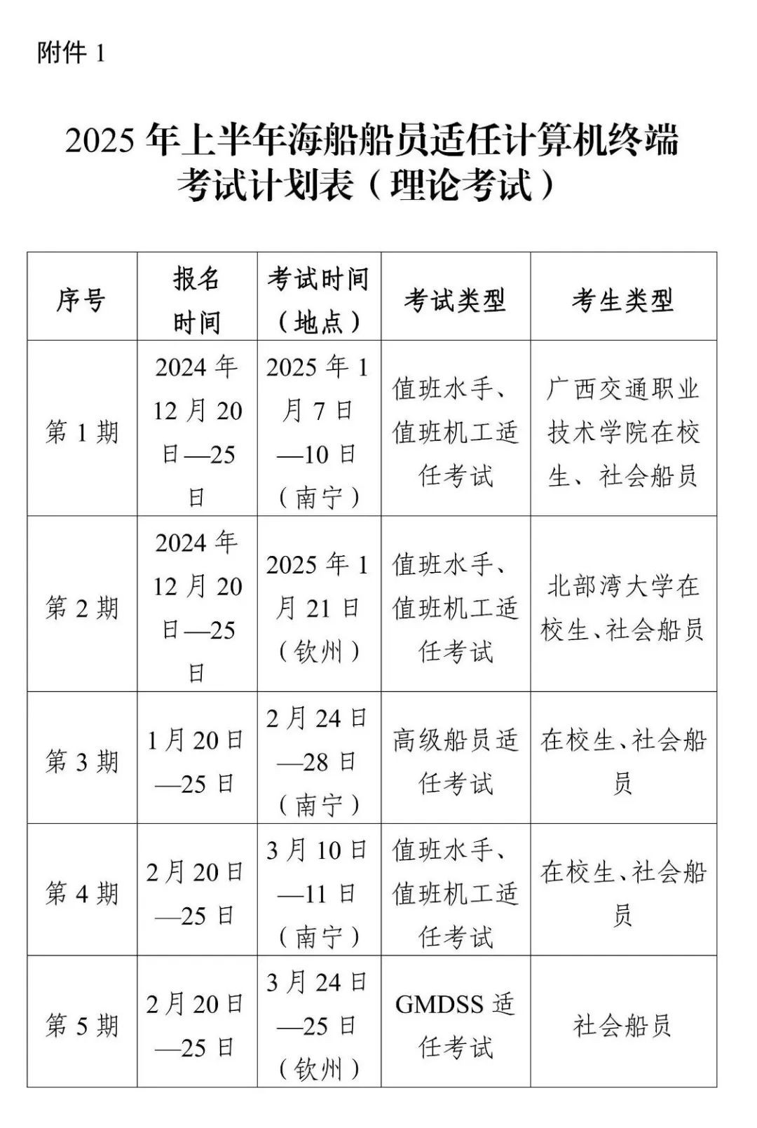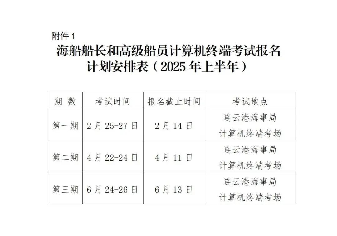 1.时间安排:2025年上半年共举办3期海船船长和高级船员适任理论考试,全部采取计算机终端进行,具体考试安排见附件1。
