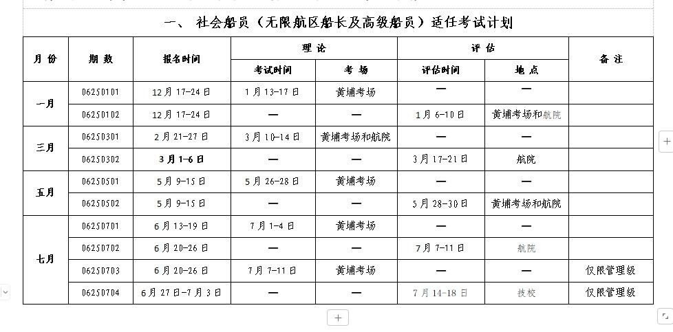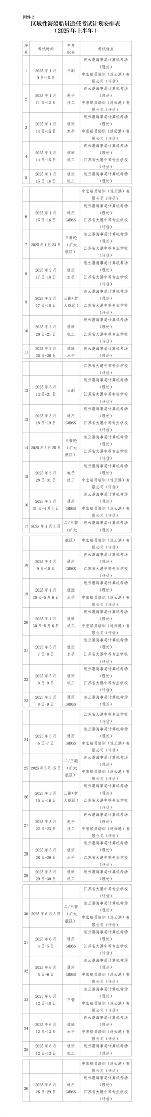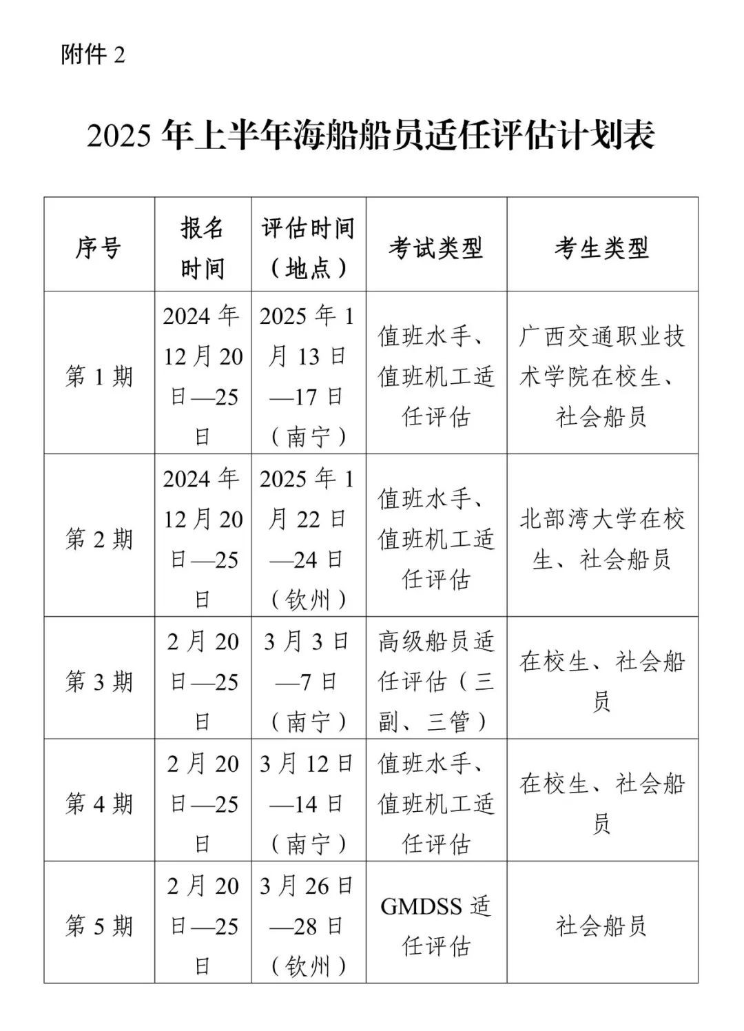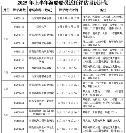 (二)海船高级船员适任评估时间和地点安排详见“2025年上半年海船船长和高级船员适任评估时间安排表”(附件第二项)。