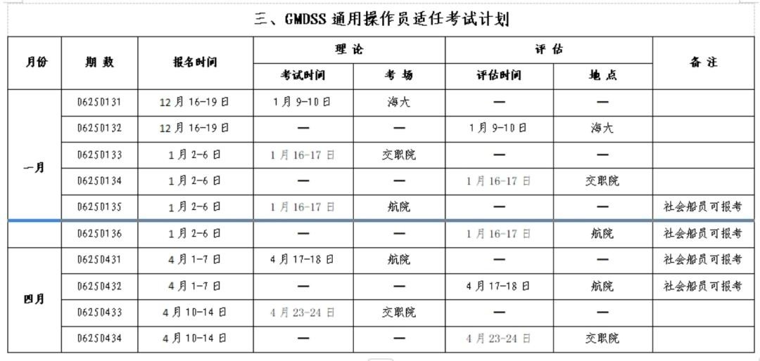 2025年上半年GMDSS操作员理论考试共1期,适任评估1期,具体时间安排如下。