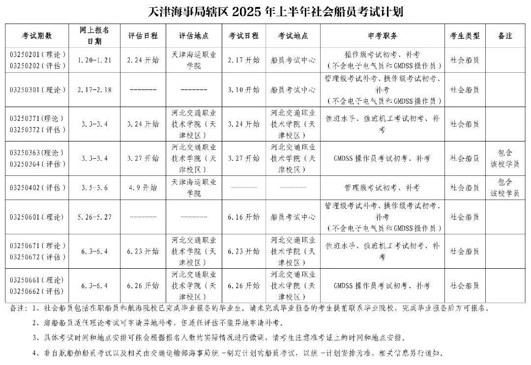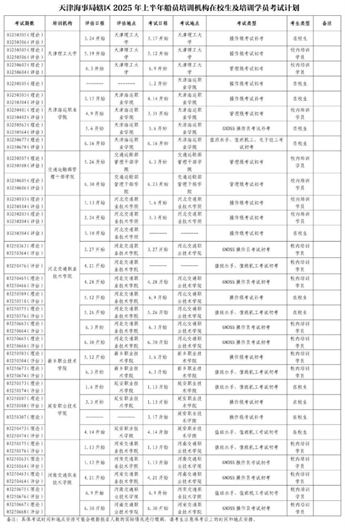 天津海事局辖区2025年上半年船员培训机构在校生及培训学员考试计划