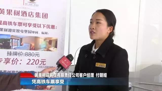 黄果树迎宾馆有限责任公司客户经理 付朝娅:游客凭着高铁车票可以享受到我们黄果树景区,160块钱门票的五折优惠,也就是相当于80块钱。其次在黄果树迎宾馆酒店,凭高铁车票享受,每晚220块钱一间房。