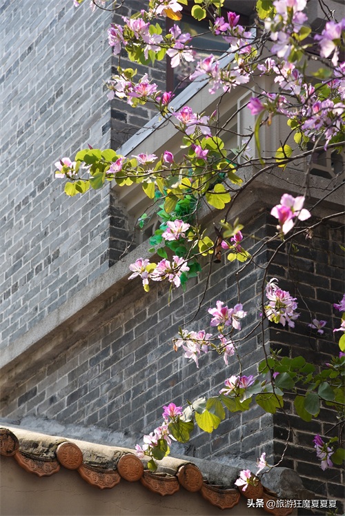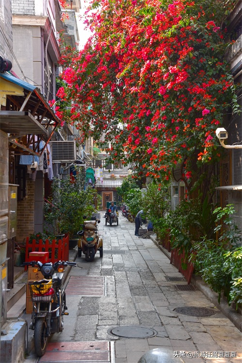 随便走进一个巷子都能看到锦簇的花团,不愧为广州“花城”之名,而错落有致地分布在巷子里的民居,就能看到很多地道的“广州味”,比如独具特色的“趟栊门”,这个中间横架着十几根圆木的木框,既是广州古代的防盗门,也是小孩攀爬的游乐地,还能保证通风,不得不佩服古人的智慧。