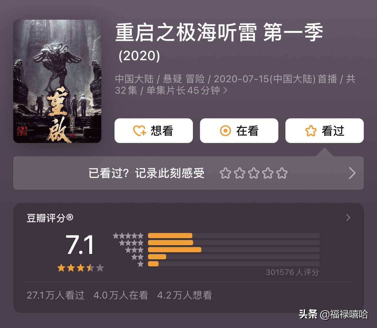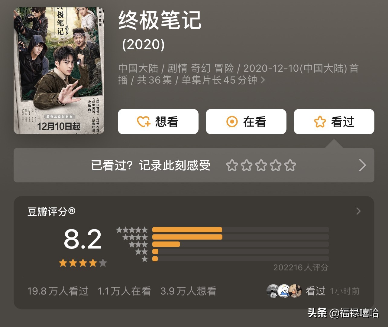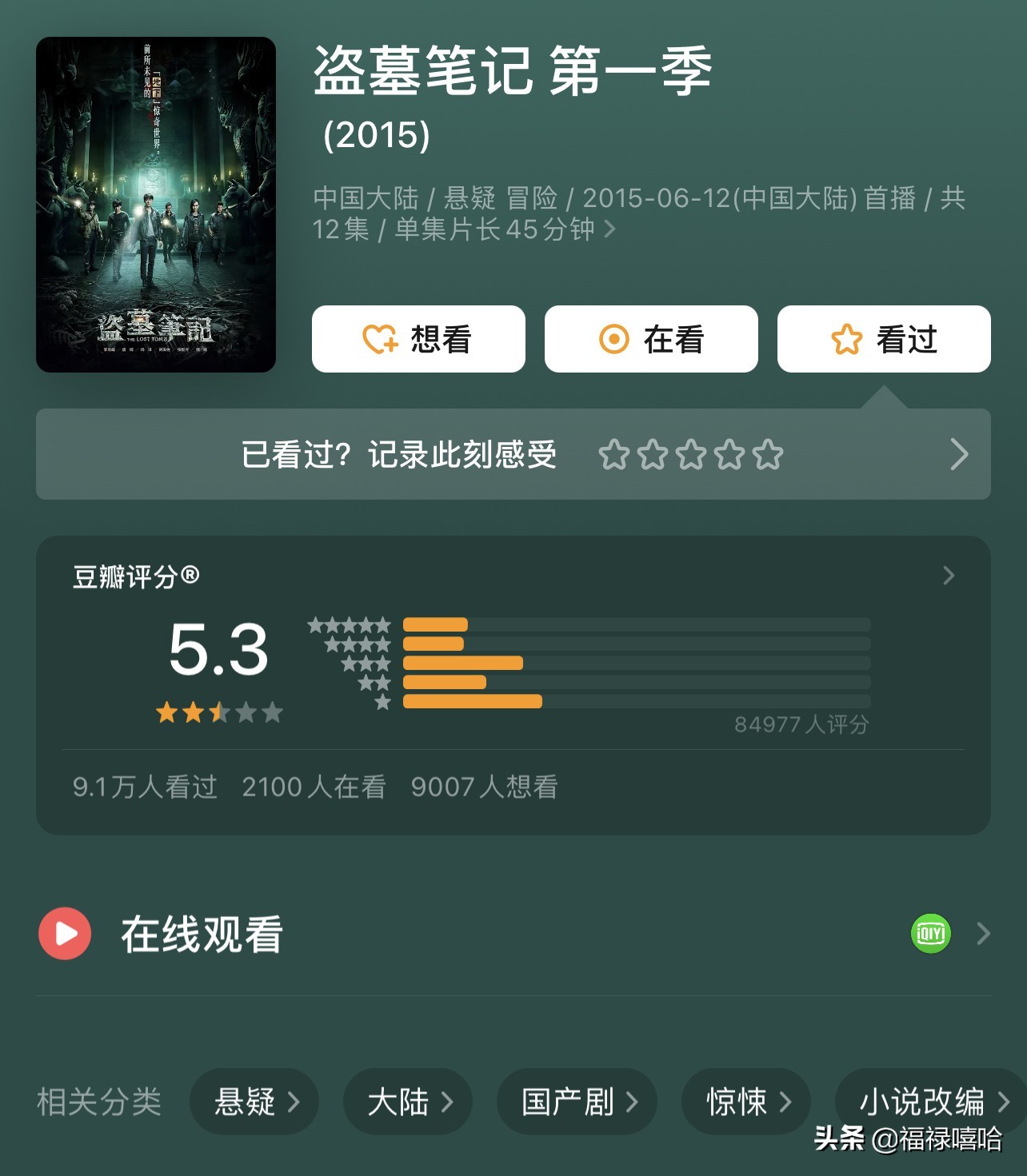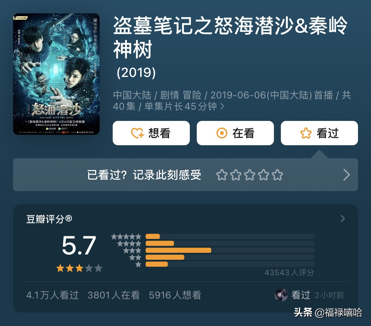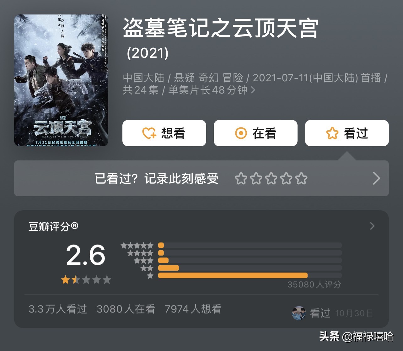 最后来说说今年刚刚播完的这部《盗墓笔记之云顶天宫》吧,相比之前几部,这部确实差了点意思,小哈至今打开过n次,都没坚持住,半途弃了。两位主角演员大家似乎也不太熟,白澍虽然参演过几部大IP的剧集,但反响平平;而出演小哥的赵东泽更是有点娱乐圈萌新的赶脚。从豆瓣评分也可以看出,大家对这部系列作品并不满意。
