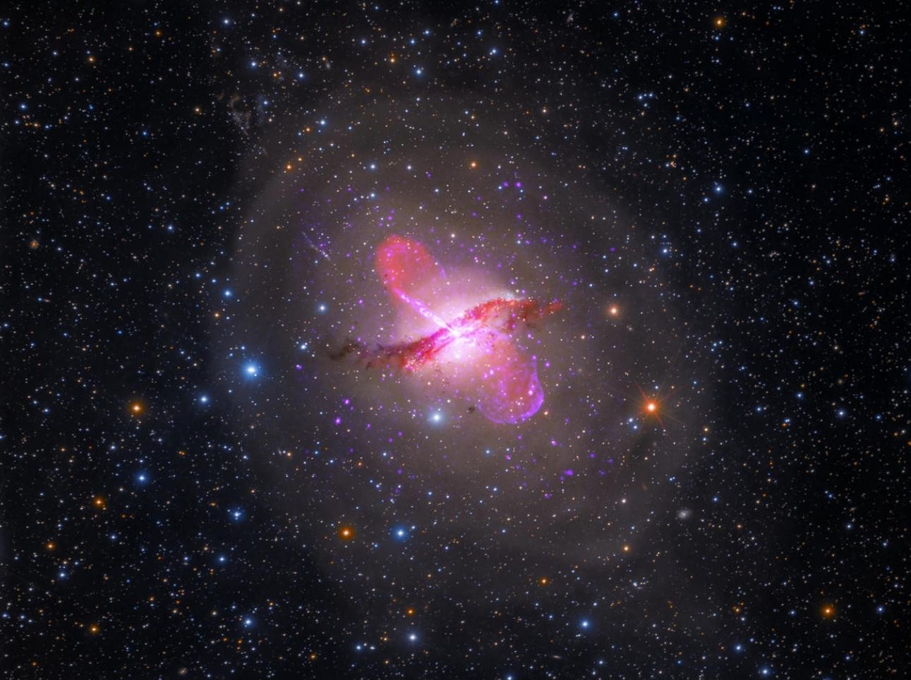 这张图片是哈勃太空望远镜的可见光信息和新墨西哥州甚大阵列射电天文台的无线电数据的合成。