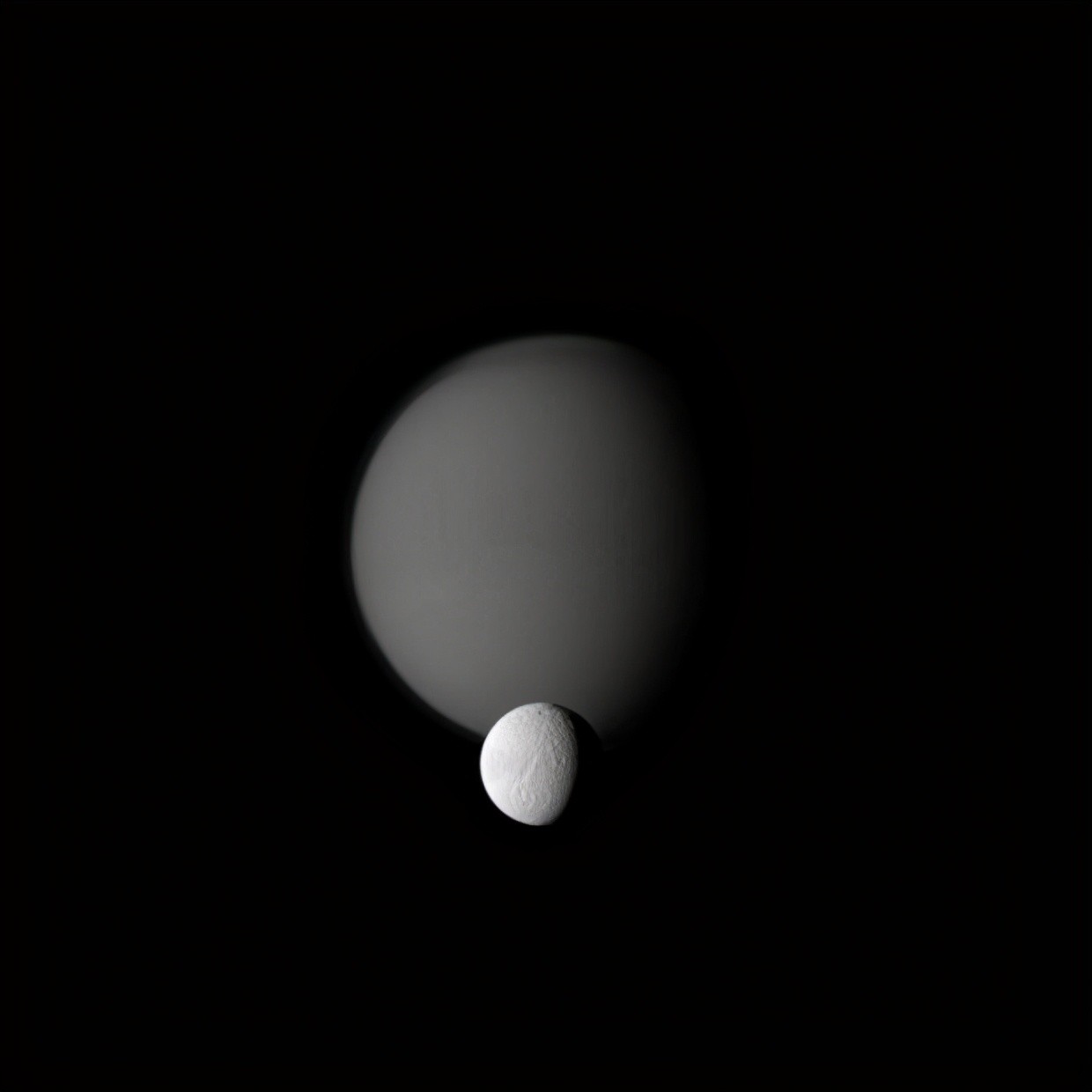 这个叫迪奥内。它是地球第四大卫星,距离土星 234,500 英里。这与地球到月球的距离大致相同。