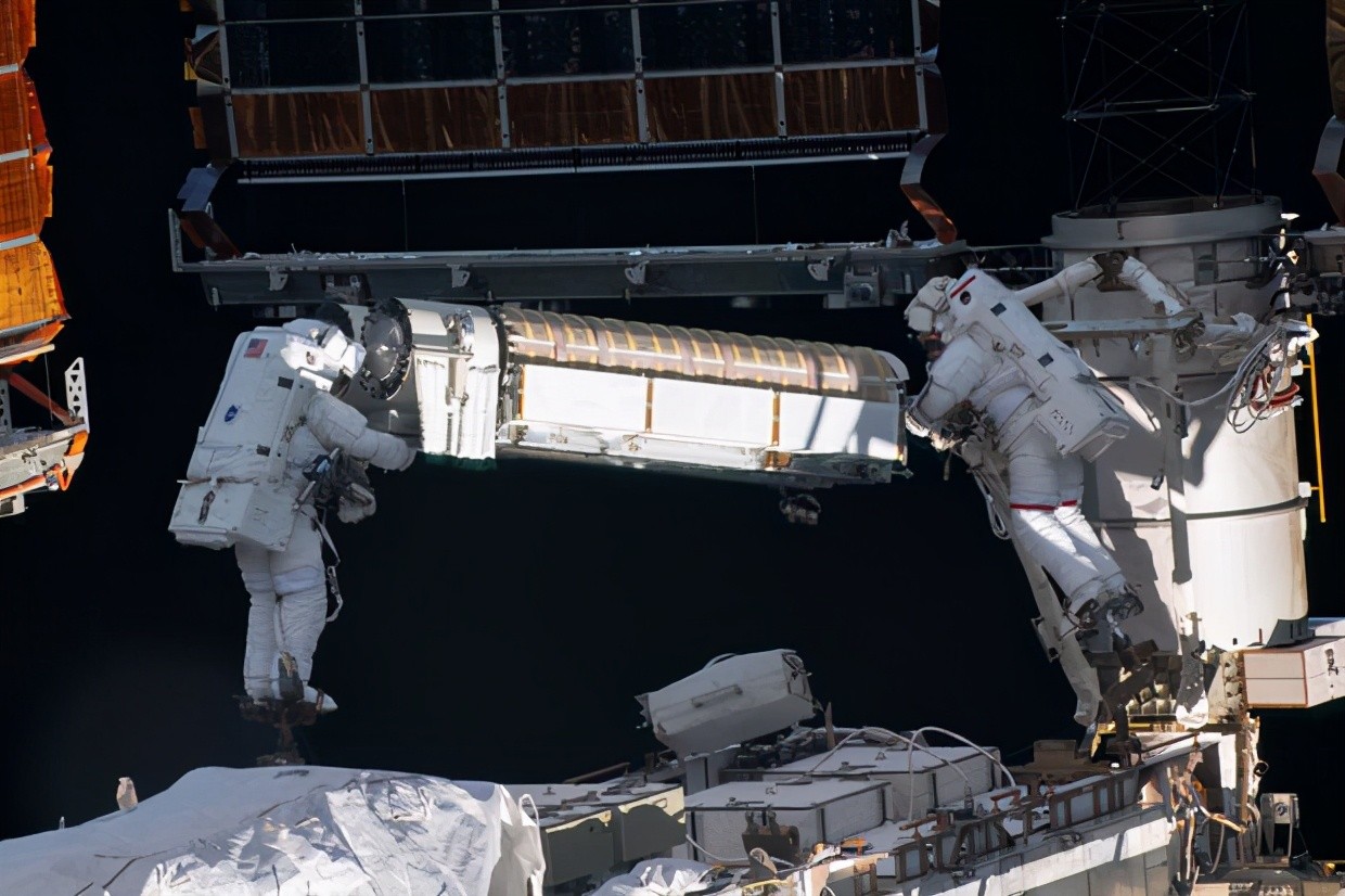 在这里,NASA 的 Shane Kimbrough(左)和欧洲航天局的 Thomas Pesquet 在国际空间站的外部安装了新的太阳能电池阵列。