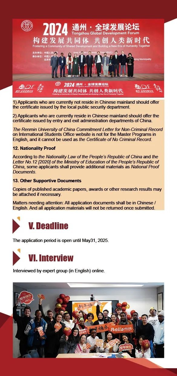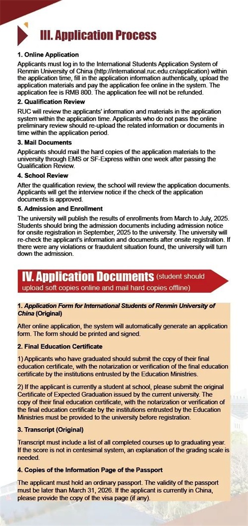 Please note: International Students Office (ISO) of RUC will review the application materials during the application period. Applicants who do not pass the preliminary online review shall resubmit the application materials before the deadline. Late application will not be accepted after the deadline.