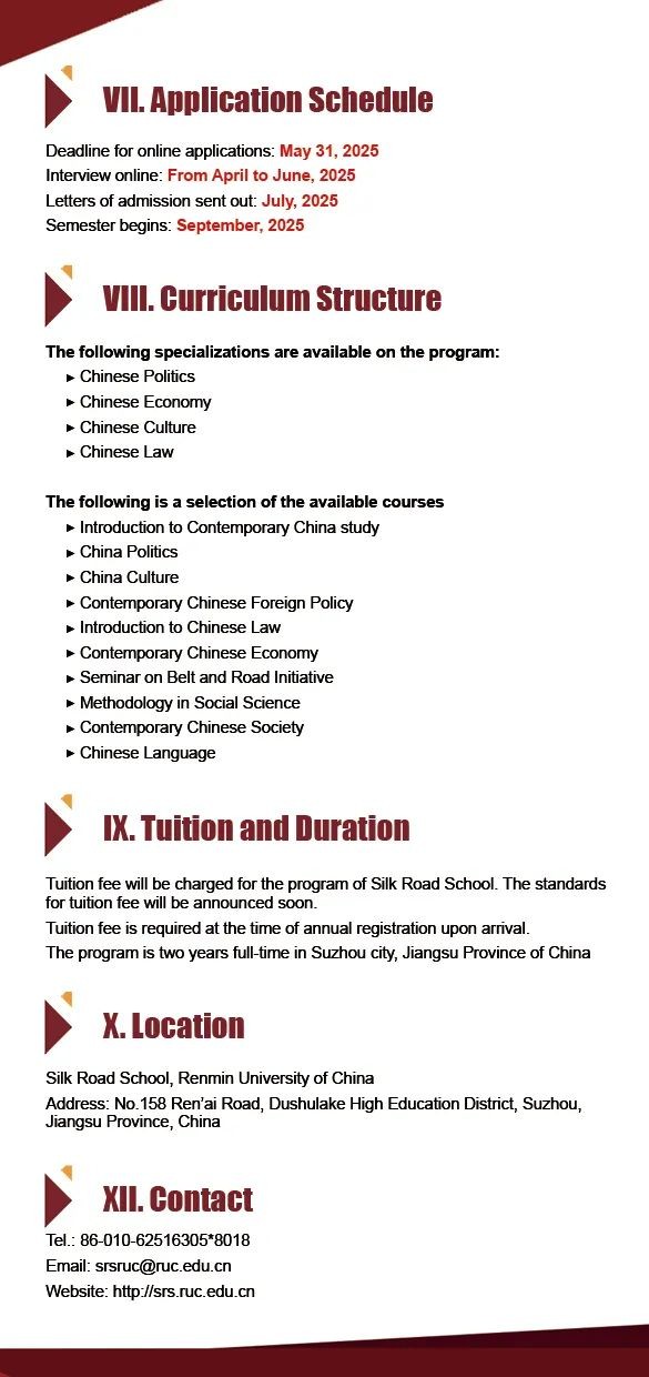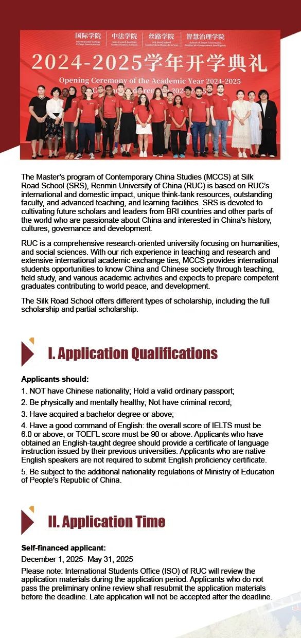 The Master’s program of Contemporary China Studies (MCCS) at Silk Road School (SRS), Renmin University of China (RUC) is based on RUC’s international and domestic impact, unique think-tank resources, outstanding faculty, and advanced teaching, and learning facilities. SRS is devoted to cultivating future scholars and leaders from BRI countries and other parts of the world who are passionate about China and interested in China's history, cultures, governance and development.