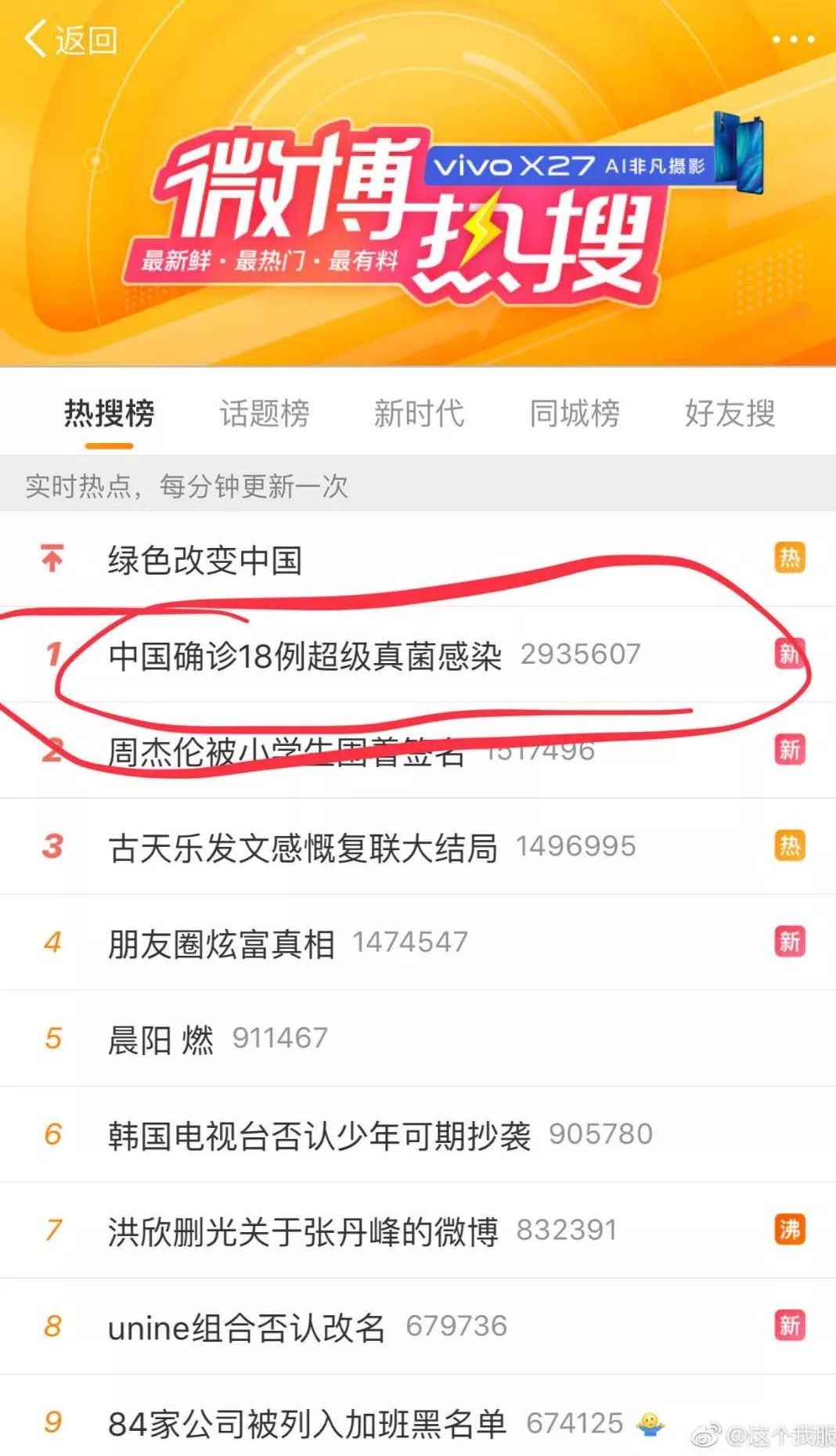 今天,“中国确诊18例超级真菌感染”的新闻登上了微博热搜榜的第一位。