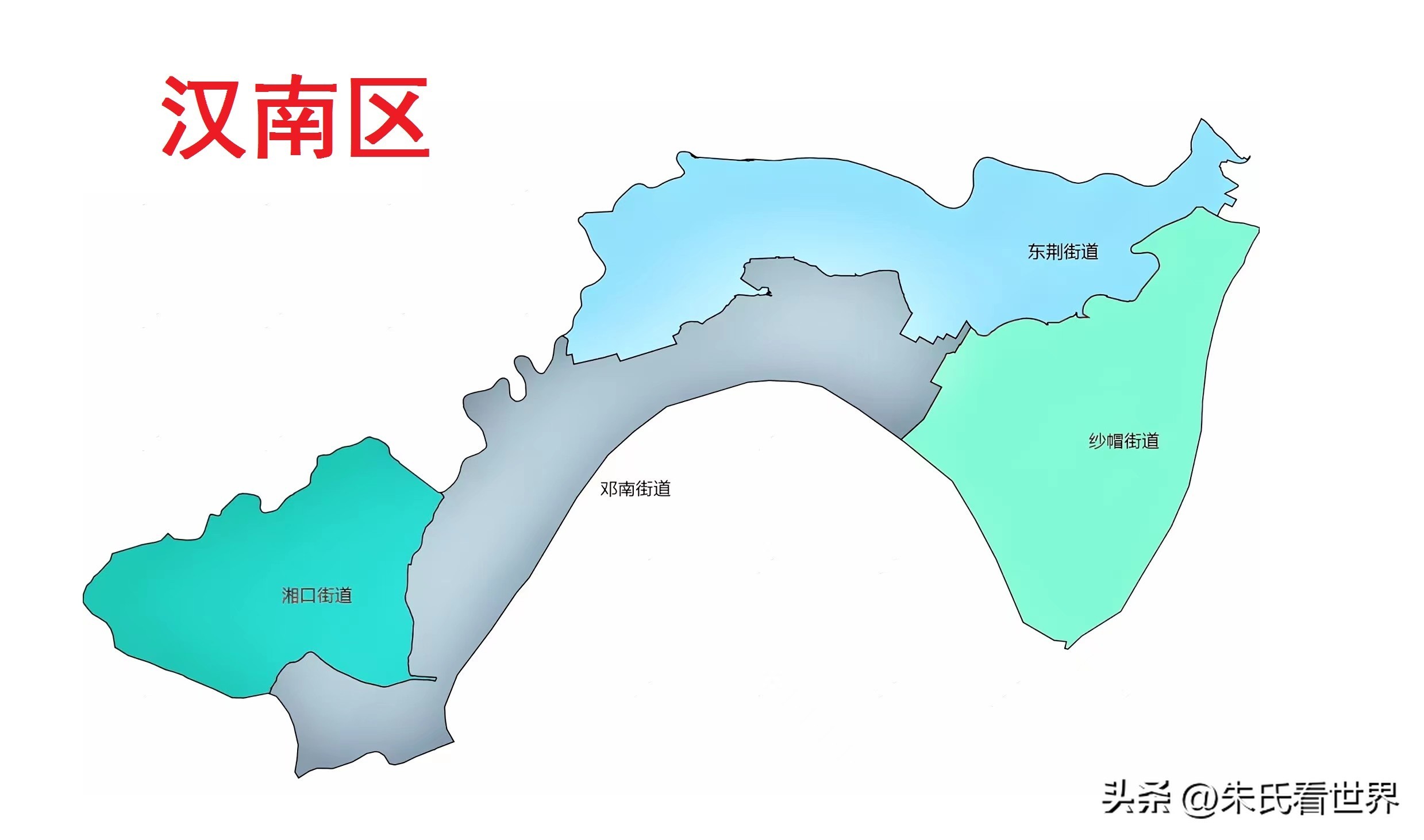 汉南区(与武汉经济技术开发区实行“政区合一”管理体制),区政府驻纱帽街道。位于武汉市域西南部、长江北岸,区境东与江夏区、洪山区隔长江相望,南与咸宁市(嘉鱼县)隔长江相望,西南与荆州市(洪湖市)相连,西与仙桃市毗邻,北与蔡甸区、汉阳区接壤。