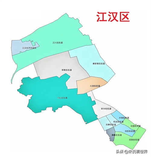 江汉区,区政府驻北湖街道。位于武汉市域中部、主城区东北部、长江北岸,区境东与江岸区接壤,东南与武昌区隔长江而望,南与硚口区毗邻,西、北同东西湖区相接。