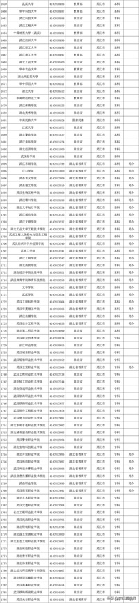 武汉市高校有:大学本科武汉大学(985)、华中科技大学(985)、武汉理工大学(211),中南财经政法大学(211),华中师范大学(211),华中农业大学(211),中国地质大学(武汉)(211)等46所,大专37所。