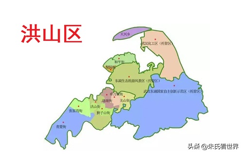 洪山区,区政府驻珞南街道。位于武汉市域中部、主城区东南部、长江南岸,区境东接新洲区,东南与鄂州市毗邻,南连江夏区,西南毗邻蔡甸区、汉阳区,西北C型环抱武昌区、青山区,北接江岸区、黄陂区。