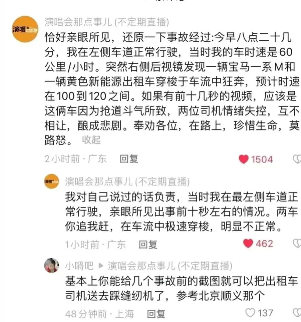 有一个当时在场的人说了事情的经过,他感觉这两辆车是在斗气,当时在车流中两辆车极速穿梭。车速达到了100~120。这个车速可是把这路当高速公路开了,而且那还是一个多路口的地方,真是让人感到震惊。