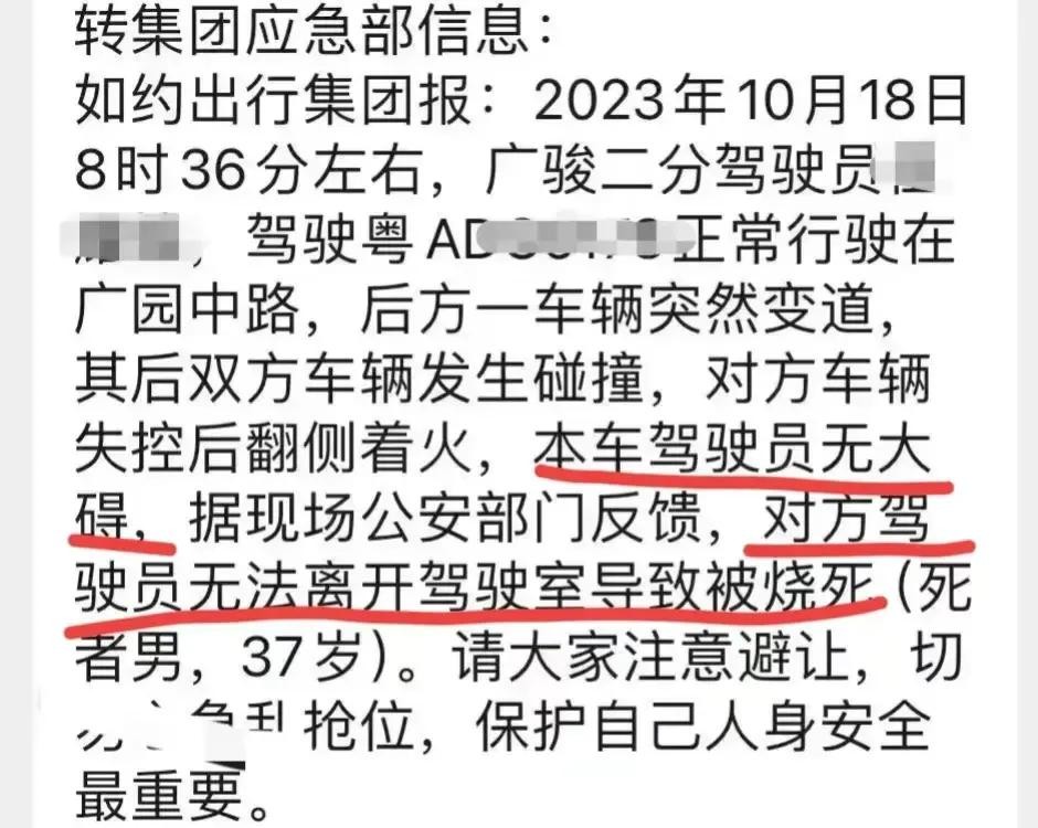 在另一份出租车集团公司的信息中,可以看到,上面写着本车驾驶员无大碍,据现场公安部门反馈,对方驾驶员无法离开驾驶室导致被烧死(死者男,37岁)。
