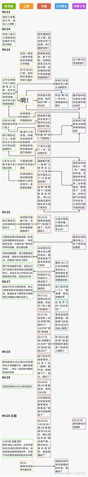 但此处疑点在于,刘鑫第一通报警电话接通时间为00:16分,持续时间3分43秒,电话结束时已接近00:20分,而突然变得急切并发出悲鸣声发生在1:40秒,即00:18分左右。而陈世锋抵达据此处200m时间为00:19分(摄像头),即离开江歌家门口时候大概在00:18分左右,补刀也大概发生在这个时间点。而陈世锋的补刀和刘鑫悲鸣发生在了接近的时间,已知猫眼无法清楚观察到外部情况,而刘鑫此时断然是不敢打开门的,刘鑫却突然急切,是否为巧合,亦或者隔门听到声响,无从判断。需要更多证据。