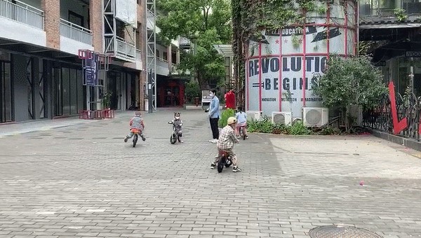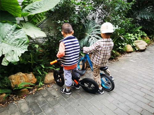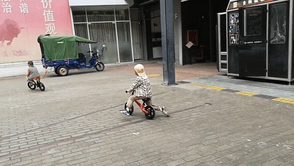 看2个小朋友在玩比赛,丰宝骑的柒小佰更快▼