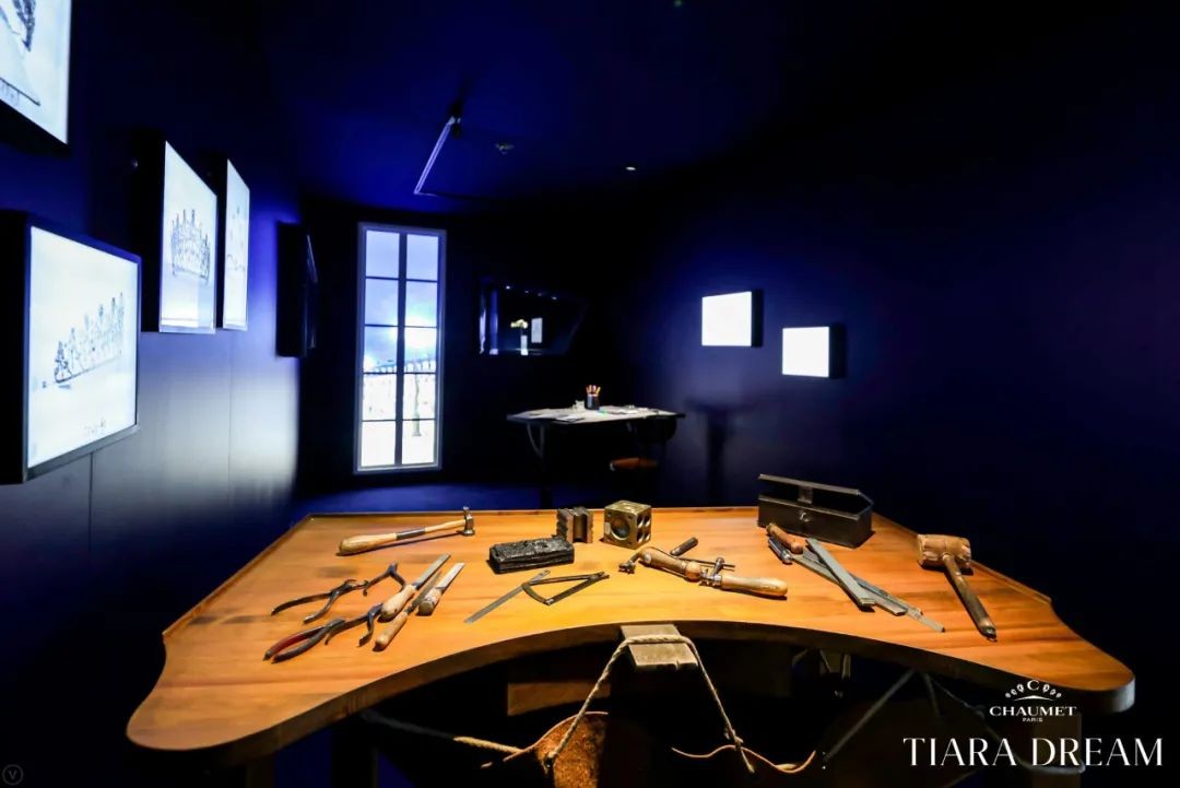 这间“创想力量”展厅,还原了芳登广场12号内部的CHAUMET珠宝工坊,揭秘珠宝从创意化作现实幕后的一切。现场摆放着一张设计桌和一张工匠桌,可以看到手绘图纸和冠冕模型,感觉身临其境,把世家工坊大师们的工作环境搬到了眼前。