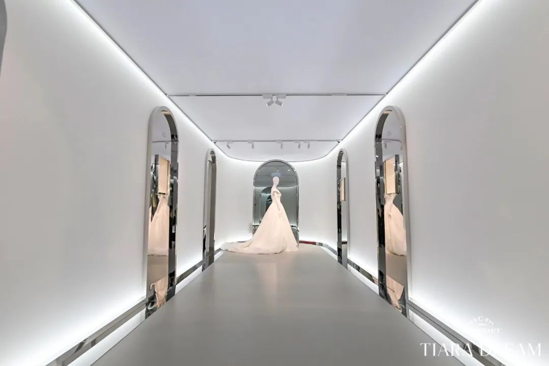 在“为爱加冕”展厅里,穿着婚纱礼服的模特伫立在纯白色空间,现场播放着唯美的婚礼音乐,立刻就能唤起每个人对幸福未来的憧憬。