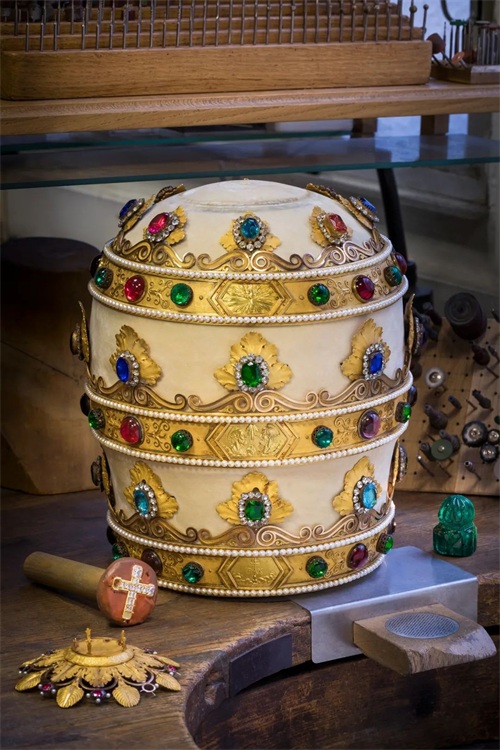 在旁边的AR屏幕上,还能看到这顶庇护七世教皇三重冕。因为当时宗教的地位高于君主,教皇庇护七世出席了拿破仑加冕大典,拿破仑为表示谢意,专门请CHAUMET创始人制作了这顶三重冕赠与教皇,是拿破仑送出过最贵重的外交礼物之一,这也是CHAUMET权力珠宝属性的重要体现。