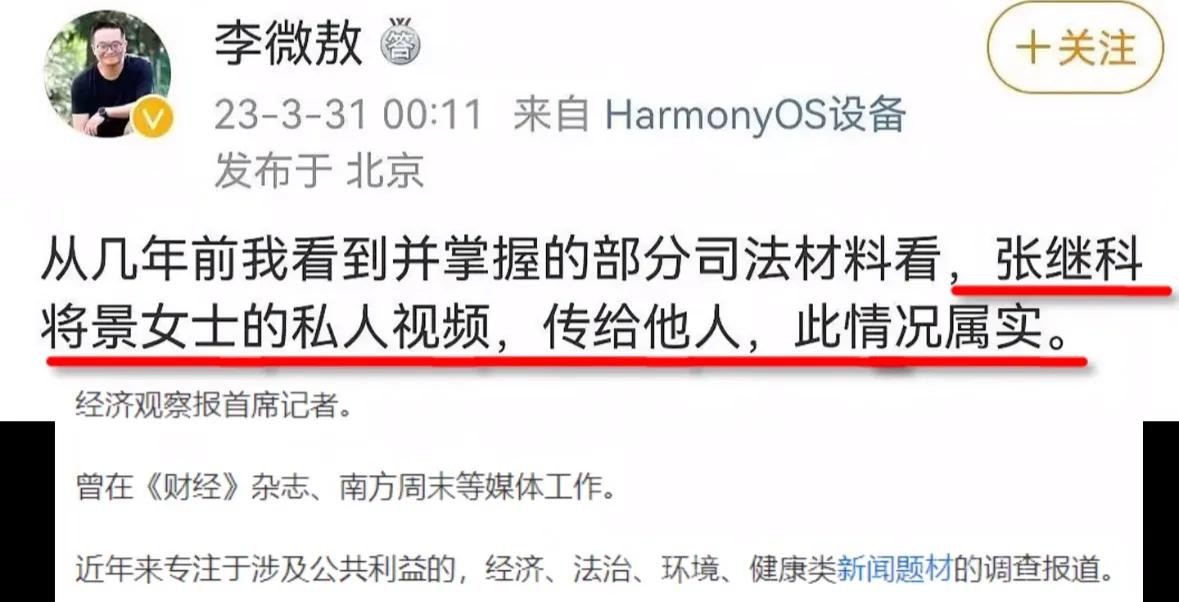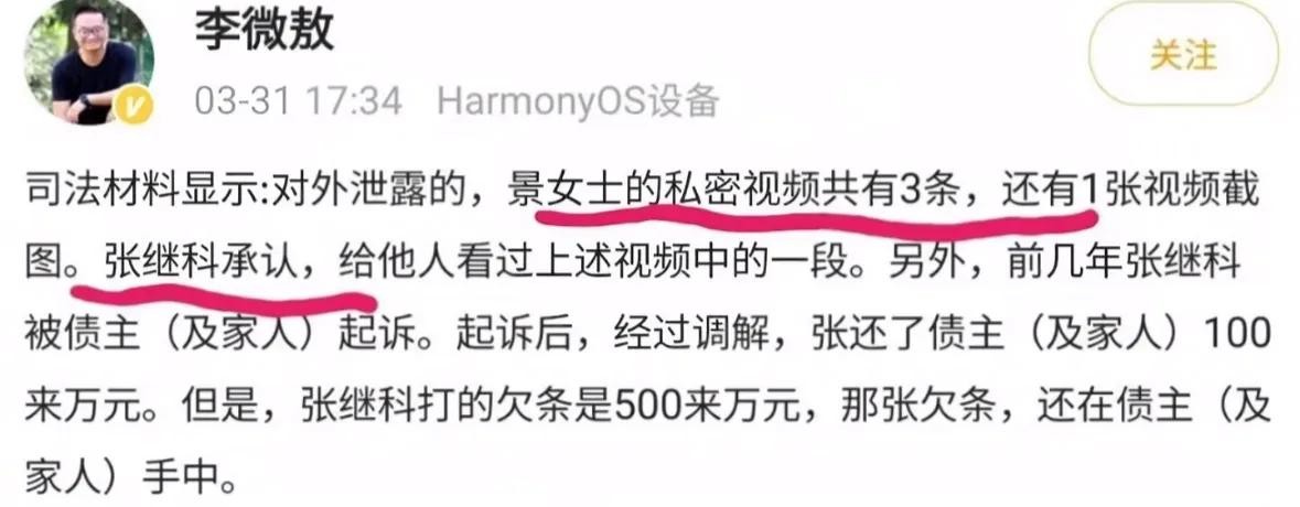 结果没过多久,记者李微敖发文称张继科欠债及外泄景甜私密视频皆属实,而且是根据司法材料所知,且根据材料显示,张继科亲口承认过。