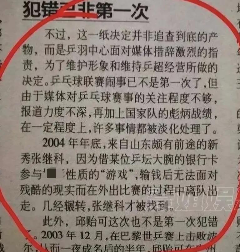 前 04 年的时候就有张继科输钱的报道,报道称一届某位乒坛大腕的银行卡参与db性质的游戏,输钱后在外出比赛过程中离队出走,而同年他因违反队规被退回省队。