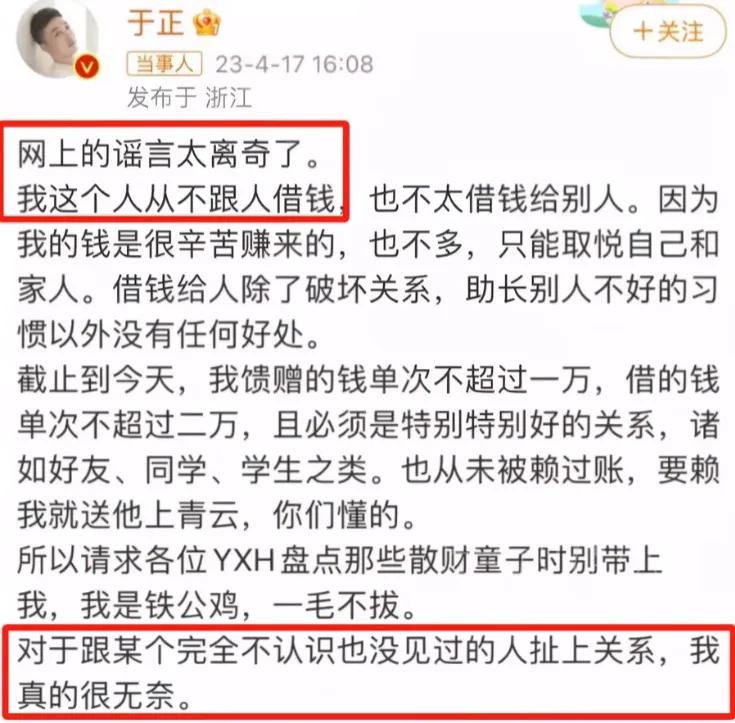 因此在张继科事件的加持之下,这张名单也引发了网友的热议。不过后期名单当事人之一的于正出面辟谣,称自己根本不认识张继科,也从不借钱给别人,直接把自己和张继科事件撇得干干净净。