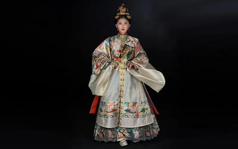 明华堂对汉服传统纹饰的研究与复原是其备受追捧的原因。2018年推出的“过肩蟒云肩通袖妆花织金纱”单品,从孔府旧藏明代服饰中获取灵感,采用了明代蟒龙、如意云、海水江牙等经典元素,并通过对金、青、红、白、黑五色的搭配运用,呈现出奢华、文雅的风范。在严格遵循传统服饰样式的同时,明华堂在袖长、袖宽,以及领口等的设计上,都会根据顾客的实际需求订制,只有这样才能让汉服使用场景更符合当代生活。