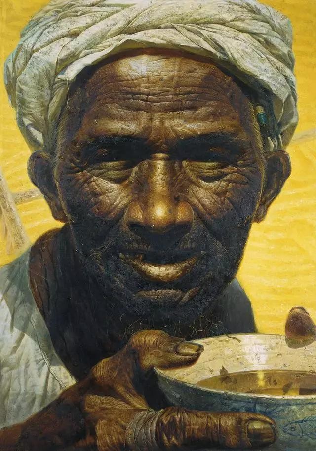 古铜色的老脸,艰辛岁月耕耘出的那一条条车辙似的皱纹;犁耙似的手,曾创造了多少大米、白面?那缺了牙的嘴,又又扒进了多少粗粮糠菜?他身后是经过辛勤劳动换来的一片金色的丰收景象,他手中端着的却是一个破旧的茶碗。作者这样鲜明的艺术语言堪称惊世之笔,心底波澜起伏,聆听内心的震撼,是作者笔下“父亲”的呼应,不用更多的语言便能随时嗅到浓重的乡土味道。罗丹说:“像在艺术领域的其他部门一样,诚挚是唯一的法则”。诚挚的作者创造了诚挚的父亲,赋予作品强大的生命力,不禁让人感叹艺术价值可以如此之高,如此之深刻。当我们凝视一个阳光下的慈父时,它的意义已不仅限于农民的力量所在,我们应该清楚的认识到它已经涉及了人类灵魂的象征。