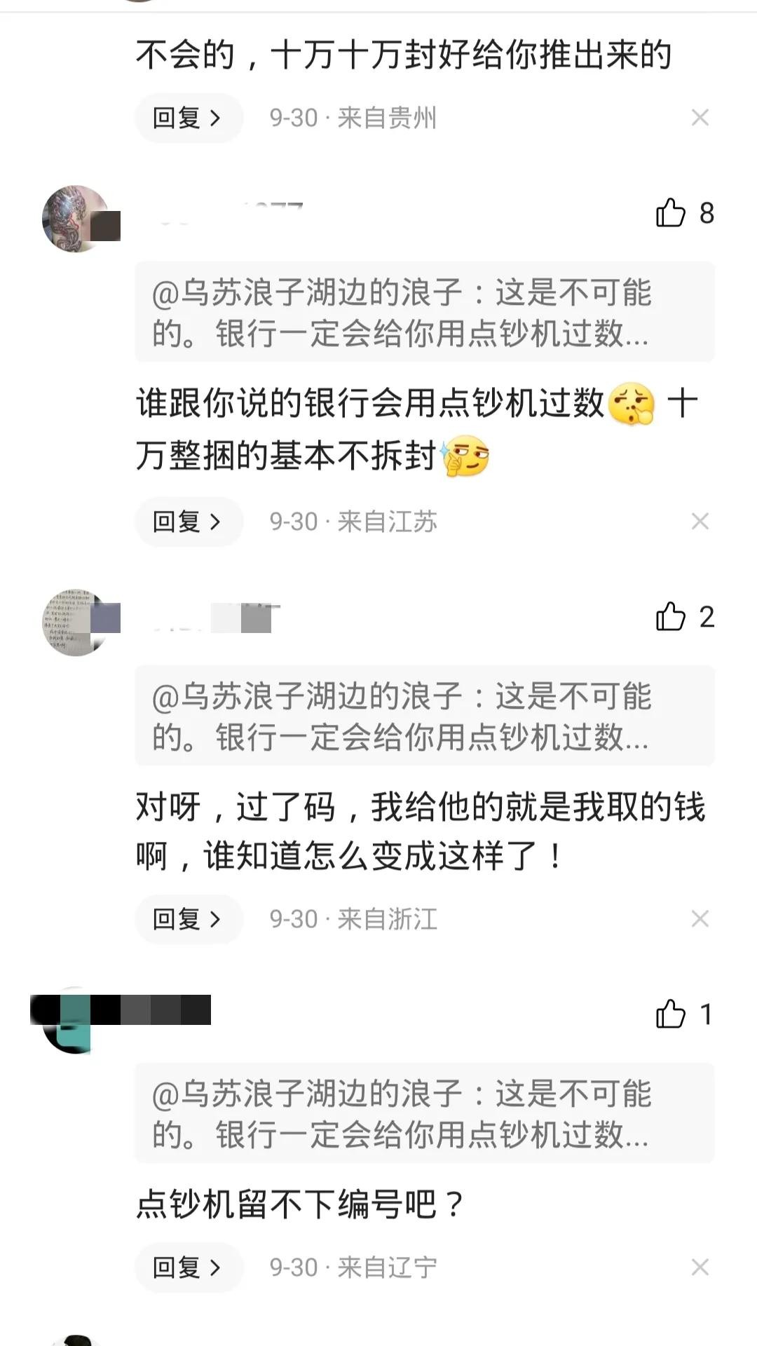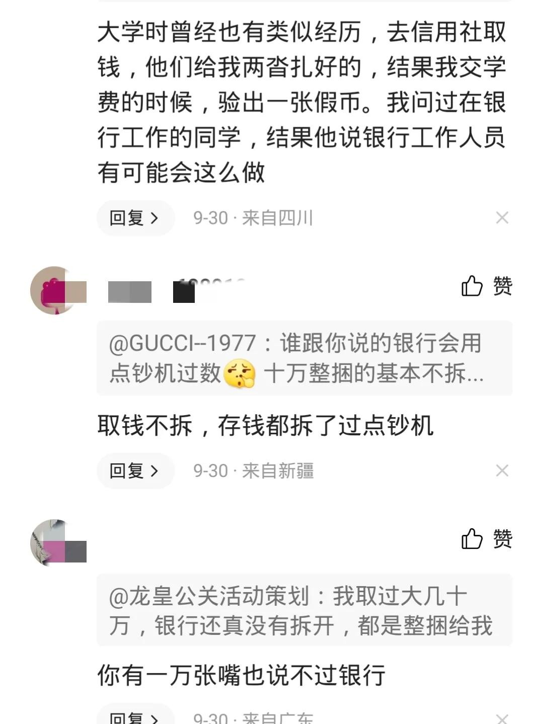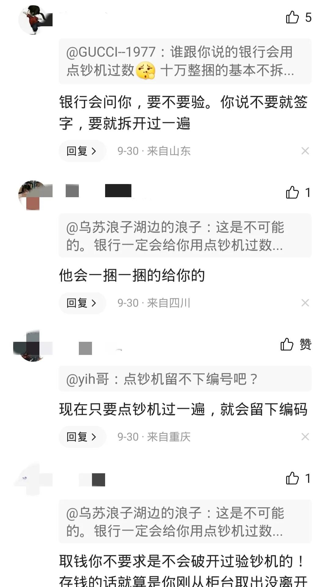 也有网友说,银行肯定会用点钞机过一遍再捆好,过数后点钞机会留下每张钱的号码。