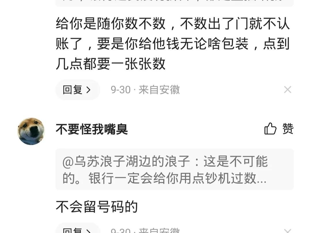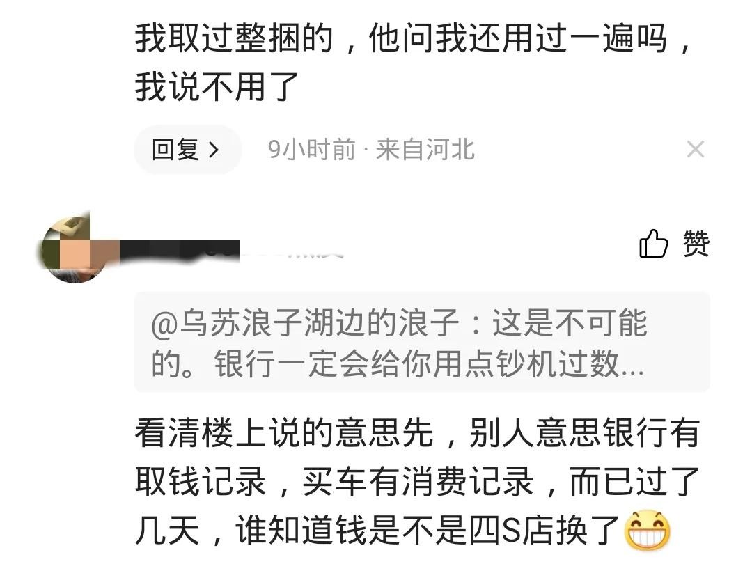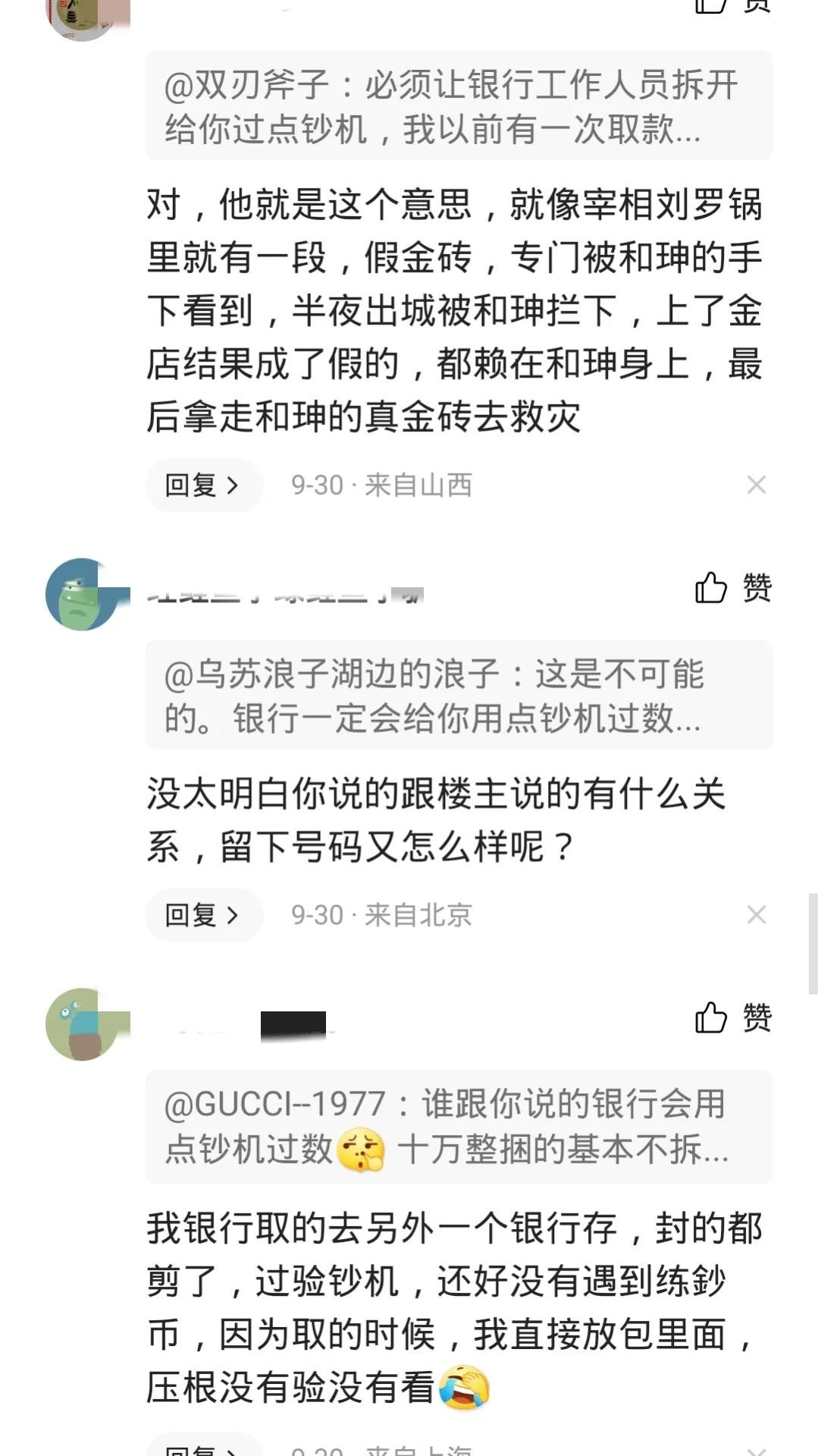 也有网友说,银行肯定会用点钞机过一遍再捆好,过数后点钞机会留下每张钱的号码。