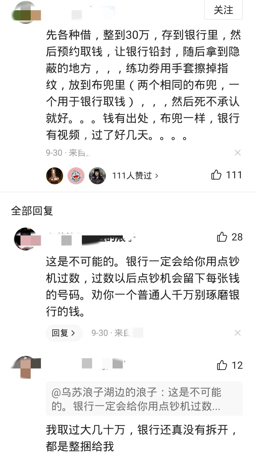 该网友表示,先各种借,整到30万存到银行里,存到银行,然后预约取钱,让银行签封,随后拿到隐蔽的地方,练功券用手套擦掉指纹,放在布兜里,两个相同的布兜,一个用于银行取钱,然后死不承认就好,钱有出处,银行有视频,过了好几天……