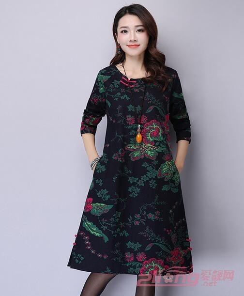 很漂亮的一款复古棉麻民族风中长款连衣裙,加绒加厚适合冬天穿着,经典简约的圆领修饰颈部线条,穿上身显瘦,非常美丽。