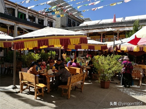 到八廓街的游人总会慕名前去看看或在此停留,俨然如同是个“景点”一般。来到玛吉阿米餐吧,人们都想在这里更多地倾听仓央嘉措的故事。也因为玛吉阿米的故事让八廓街多了些许浪漫的气息。我们在玛吉阿米餐吧的三楼吃了午餐,并居高临下欣赏了八廓街的景色。