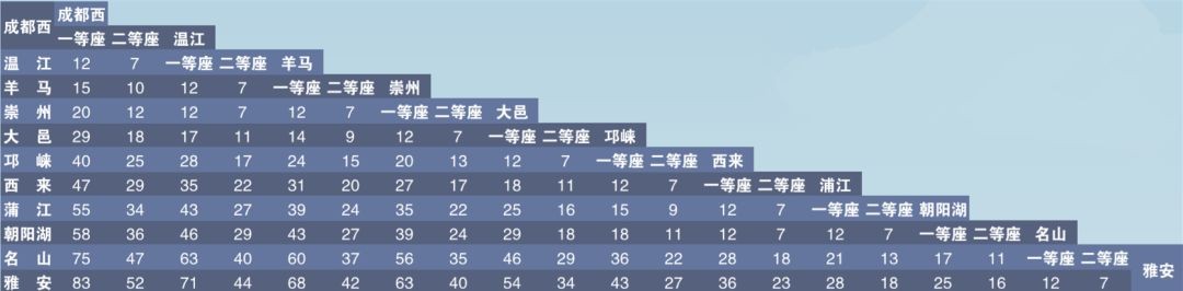 从成都西至温江7元,至羊马10元,至崇州12元,至大邑18元,至邛崃25元,至西来29元,至蒲江34元,至朝阳湖36元,至名山47元。