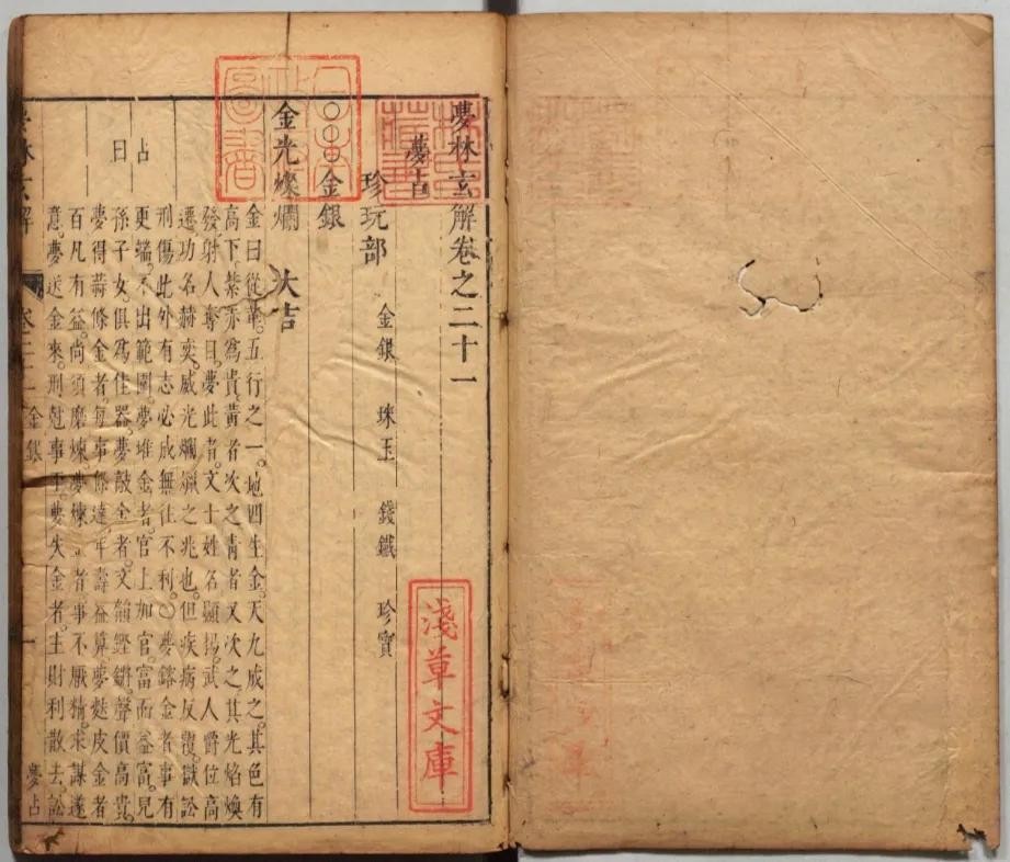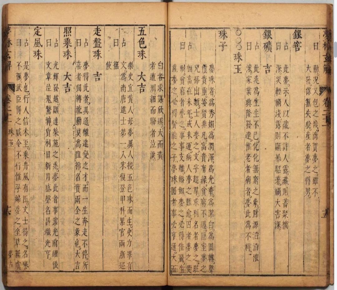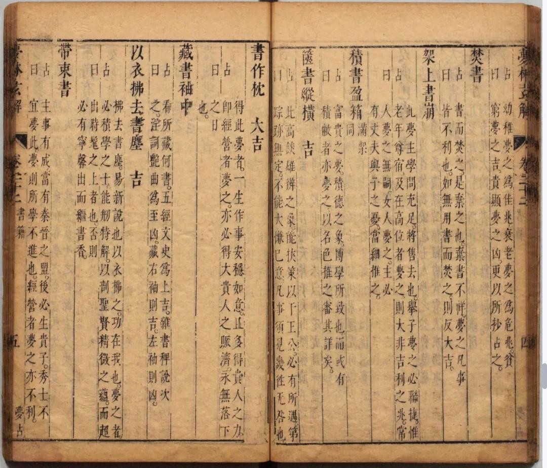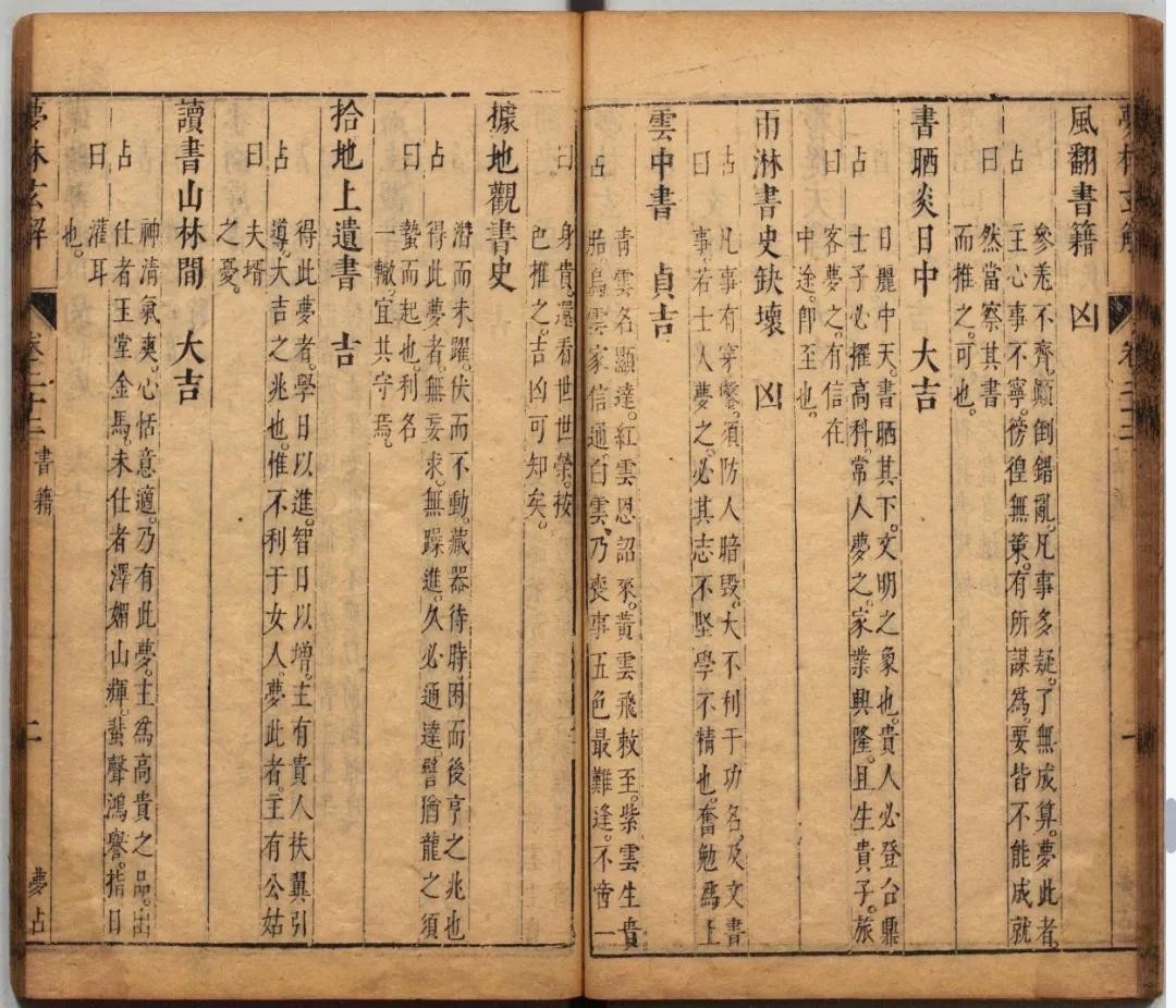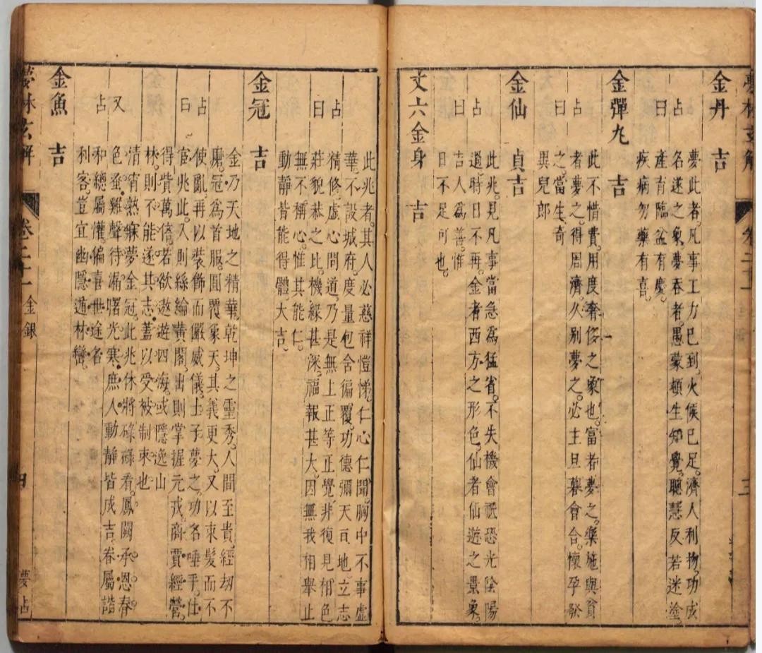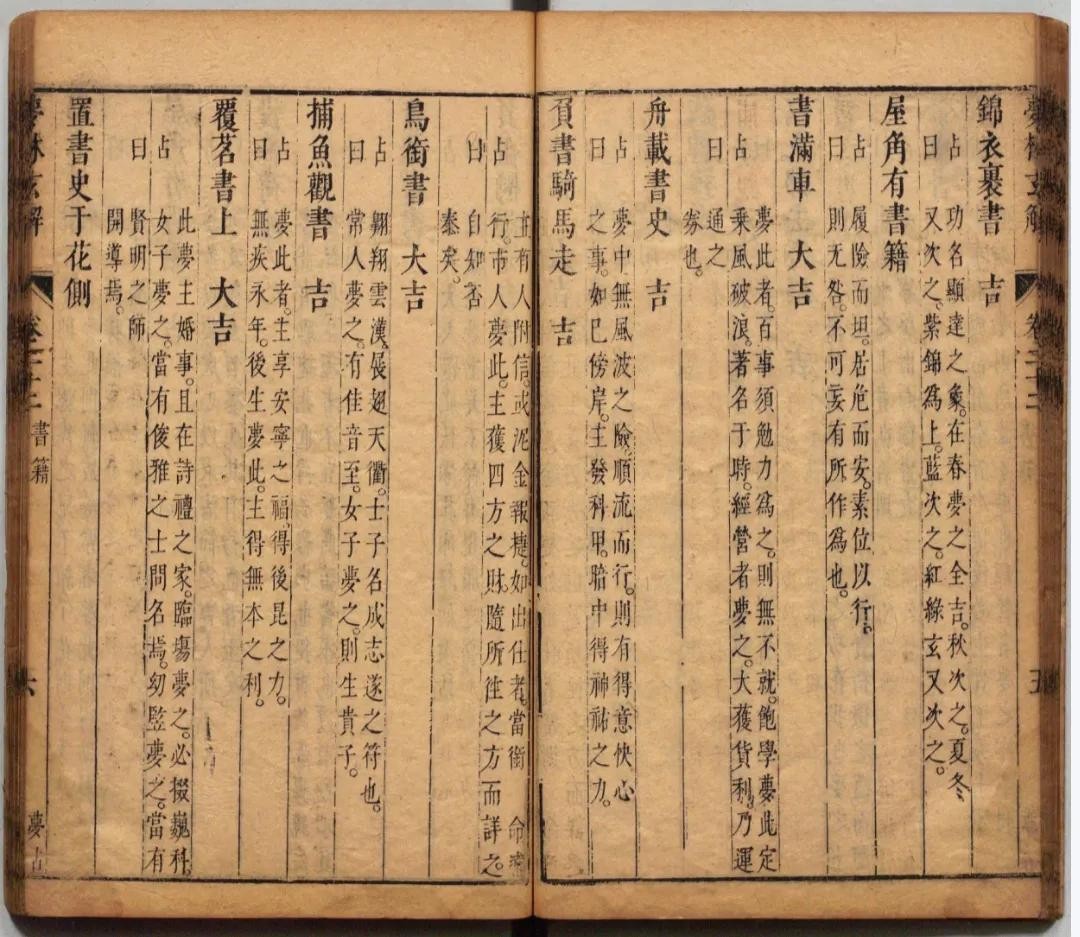 结构《梦林玄解》共分为多个部分,包括梦原、梦论、梦禳各2卷,以及梦占23卷。梦占部分详细分为天象、地理、人物、形貌、政事、什物、栋宇、服饰、蕃彚、飞走、珍玩、文翰、名数等多个部类。