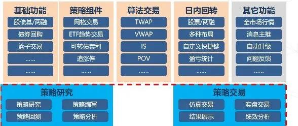 基础交易功能除了有股票和两融等基本功能,主要还具有高效的量化交易功能(策略编写,策略回测,仿真交易,实盘交易)、便捷的交易方式功能(网格交易、抢单交易、批量埋单、盘口扫单)、个性定制功能(功能定制、策略定制)、以及拥有丰富的策略工具等功能(算法交易、套利交易、移动止盈、拐点交易)。
