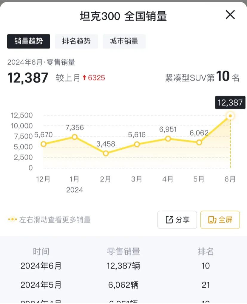 在国产越野车的领域中,坦克 300 宛如一颗璀璨的明星,以其卓越的性能和独特的魅力,成为了众多越野爱好者心中的理想座驾。相信喜欢越野的人和不喜欢越野的人对坦克都不会陌生,坦克 300 从 2020 年 12 月上市至今已经全球累计销量近 40 万辆。截止今年 6 月坦克 300 更是创下历史新高月销量达到 12387 辆。