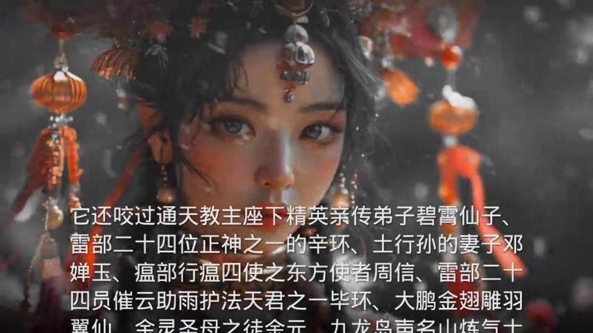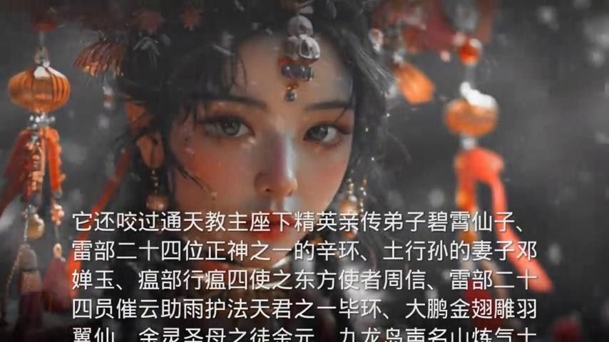 哮天犬的战绩颇为辉煌。据不完全统计,在《封神演义》中,它还咬过通天教主座下精英亲传弟子碧霄仙子、雷部二十四位正神之一的辛环、土行孙的妻子邓婵玉、瘟部行瘟四使之东方使者周信、雷部二十四员催云助雨护法天君之一毕环、大鹏金翅雕羽翼仙全又母之九龙鸟声名山炼气十。
